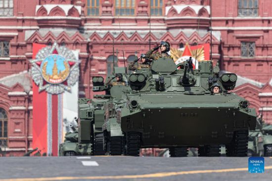 Infantry fighting vehicles are seen on Red Square during a rehearsal of the Victory Day parade in Moscow, Russia, May 7, 2022. (Xinhua/Bai Xueqi)
