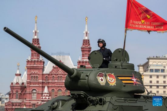 A T-34-85 tank takes part in a rehearsal of the Victory Day parade in Moscow, Russia, May 7, 2022. (Xinhua/Bai Xueqi)