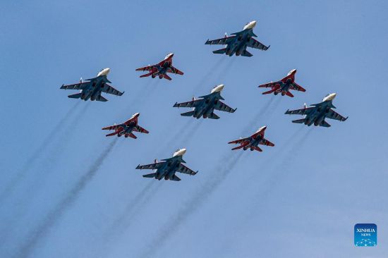 MiG-29 jet fighters of the Strizhi (Swifts) and Su-30SM jet fighters of the Russkiye Vityazi (Russian Knights) aerobatic teams take part in a rehearsal of the Victory Day parade in Moscow, Russia, May 7, 2022. (Xinhua/Bai Xueqi)