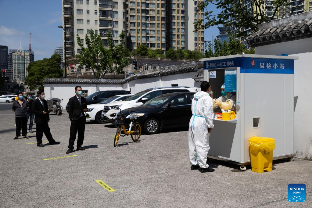 A staff member takes a swab sample from a man for nucleic acid test in Huangpu District, east China's Shanghai, May 8, 2022. Shanghai has set up fixed and mobile acid testing sites in areas such as residential communities, office spaces, business parks and in the vicinities of subway and other public transport stations in accordance with the epidemic situation. (Xinhua/Jin Liwang)