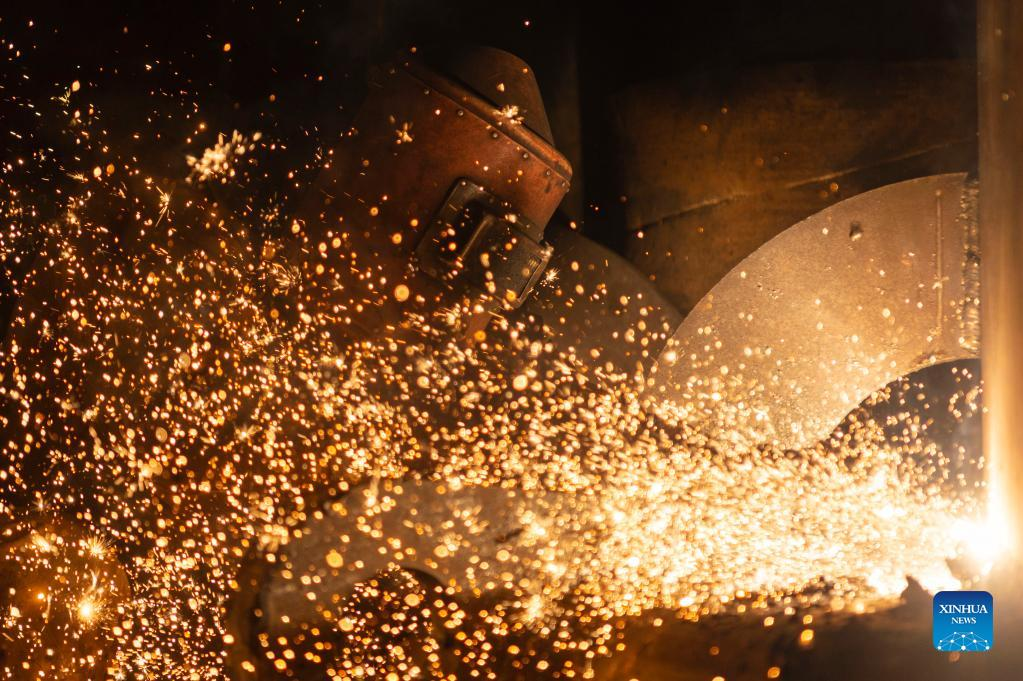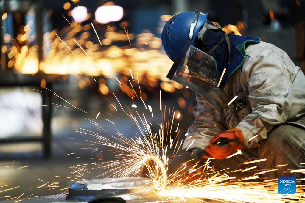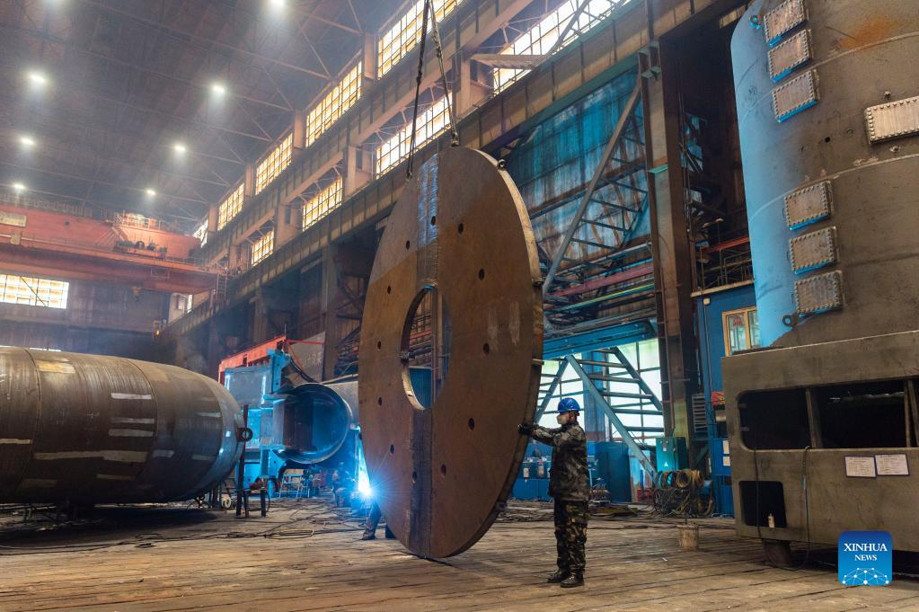 A worker is busy in a workshop of Harbin Turbine Company Ltd. of Harbin Electric Corporation in Harbin, northeast China's Heilongjiang Province, May 7, 2022. The local economy in Heilongjiang continued to recover amid stronger growth momentum in the first quarter. Heilongjiang's value-added industrial output, an important economic indicator, went up 8.1 percent year on year in the first quarter of this year. (Xinhua/Wang Jianwei)