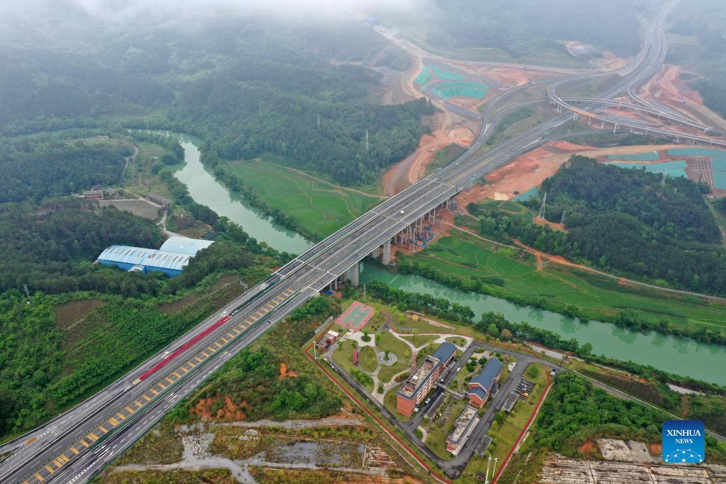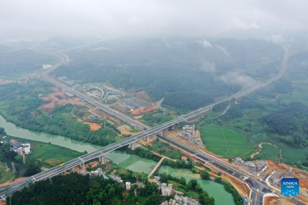Aerial photo taken on May 8, 2022 shows a view of the roads in Bama Yao Autonomous County, south China's Guangxi Zhuang Autonomous Region. In recent years, Bama has improved road network in the county to promote the economic development. (Xinhua/Lu Boan)
