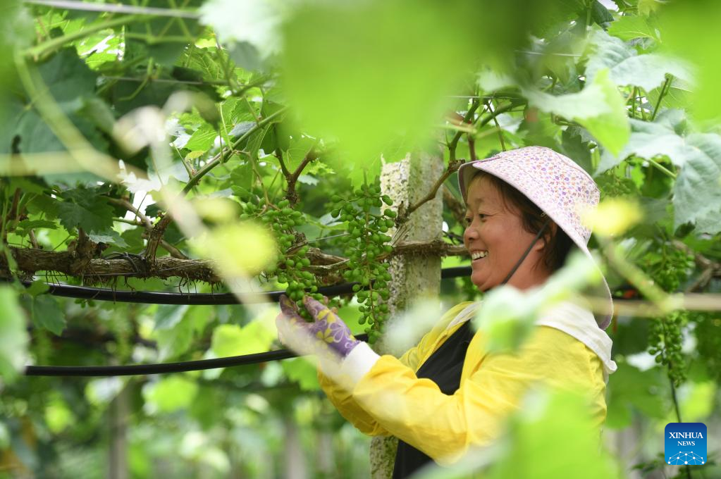 A staff member checks grapes in Dongli Village, Donglan County of south China's Guangxi Zhuang Autonomous Region, May 6, 2022. Donglan County, Bama Yao Autonomous County and Fengshan County of Hechi City are located in karst mountains in northwestern Guangxi.