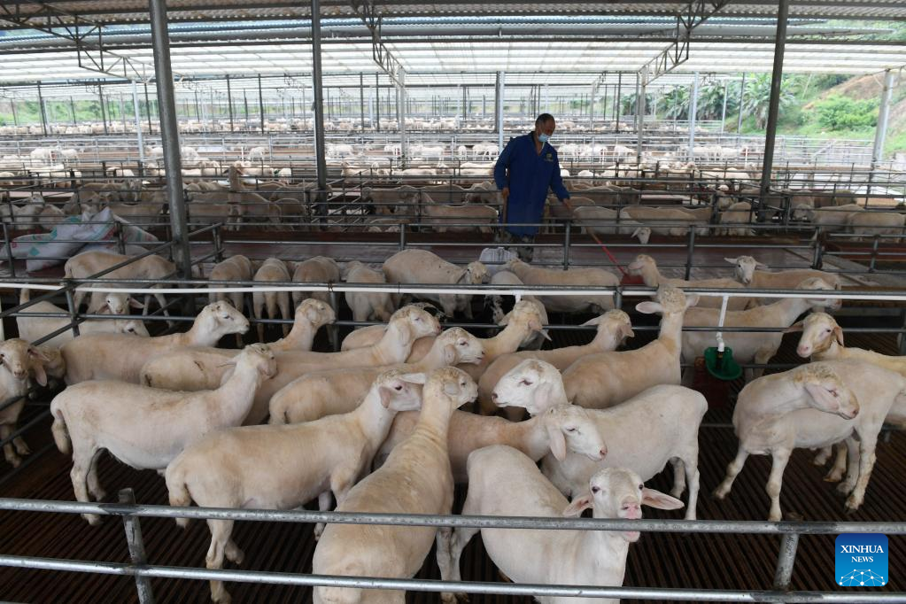 A staff member works at a sheep house of a breeding base in Dongli Village, Donglan County of south China's Guangxi Zhuang Autonomous Region, May 6, 2022. Donglan County, Bama Yao Autonomous County and Fengshan County of Hechi City are located in karst mountains in northwestern Guangxi.
