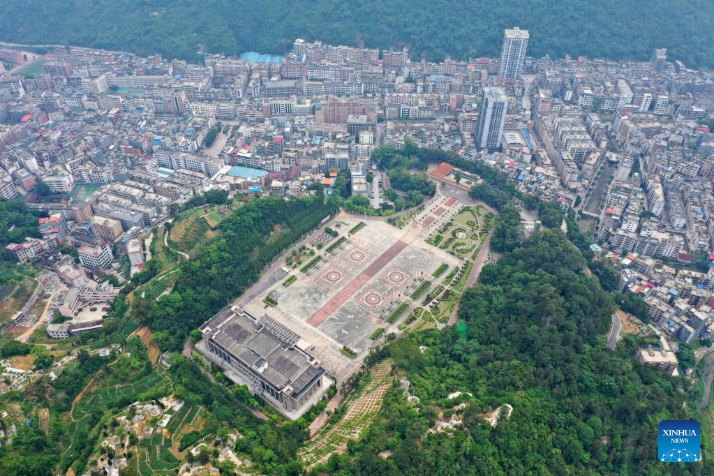 Aerial photo shows a view of Donglan County, south China's Guangxi Zhuang Autonomous Region, May 6, 2022. Donglan County, Bama Yao Autonomous County and Fengshan County of Hechi City are located in karst mountains in northwestern Guangxi.