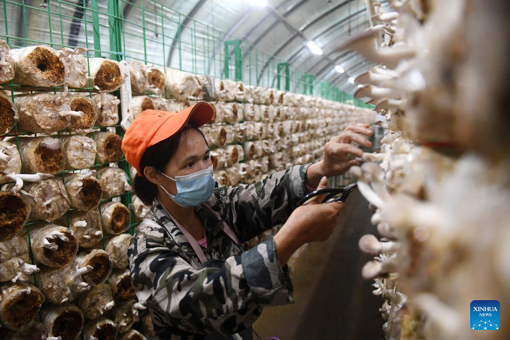 A staff member picks edible mushroom at a planting base in Donglan County of south China's Guangxi Zhuang Autonomous Region, May 6, 2022. Donglan County, Bama Yao Autonomous County and Fengshan County of Hechi City are located in karst mountains in northwestern Guangxi.