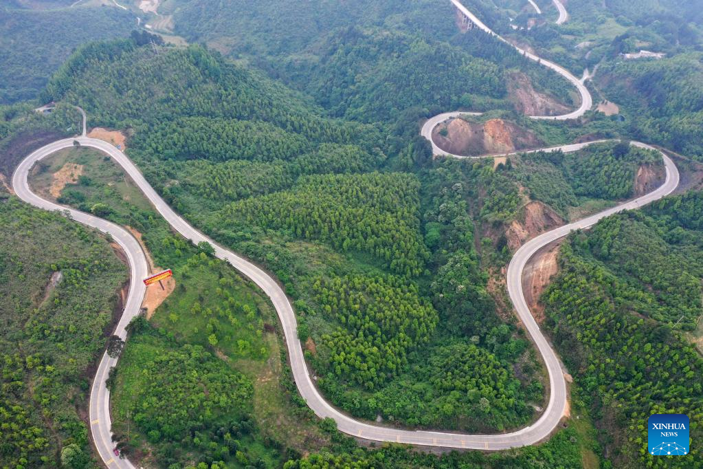 Aerial photo shows a mountain road in Fengshan County, south China's Guangxi Zhuang Autonomous Region, May 7, 2022. Donglan County, Bama Yao Autonomous County and Fengshan County of Hechi City are located in karst mountains in northwestern Guangxi.
