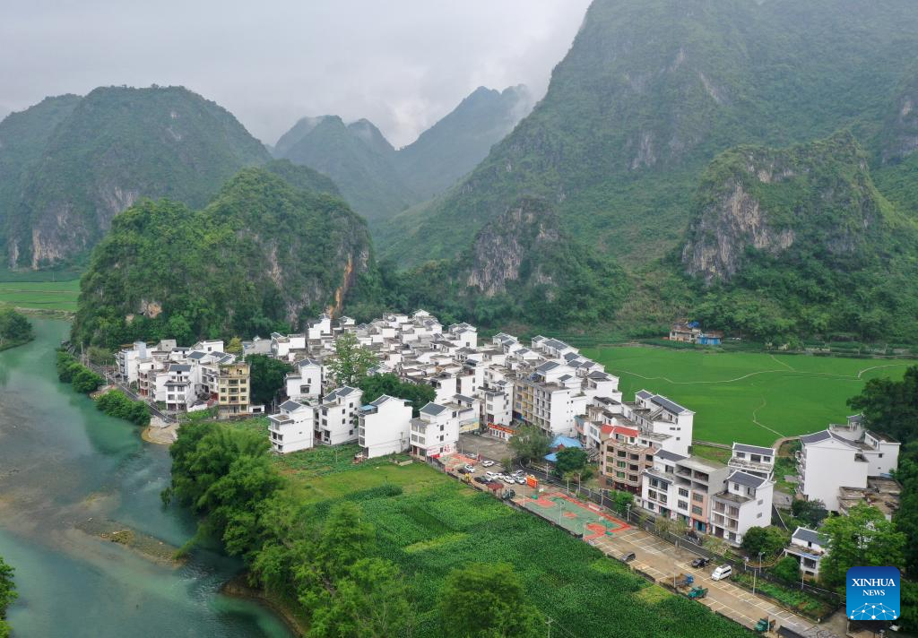 Aerial photo shows a village view of Bama Yao Autonomous County of south China's Guangxi Zhuang Autonomous Region, May 8, 2022. Donglan County, Bama Yao Autonomous County and Fengshan County of Hechi City are located in karst mountains in northwestern Guangxi.