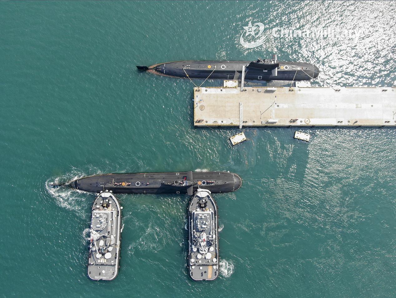 Two towboats attached to a submarine flotilla with the navy under the PLA Northern Theater Command jointly tow a submarine off a port during a maritime combat training exercise on April 19, 2022. (eng.chinamil.com.cn/Photo by Shi Jialong)