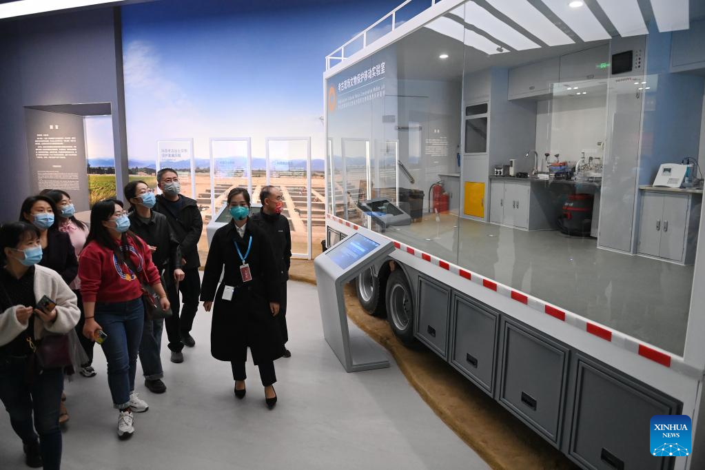 People view a mobile lab in the Shaanxi Archaeology Museum in Xi'an, northwest China's Shaanxi Province, April 28, 2022. (Xinhua/Li Yibo)