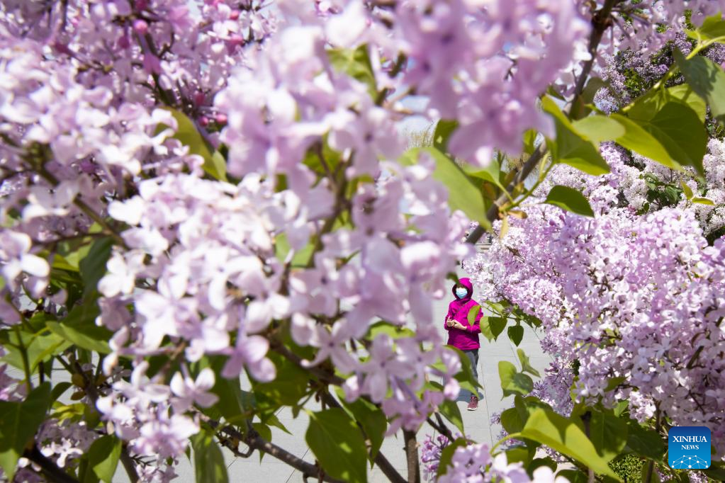 A citizen enjoys the view of flowers at a park in Harbin, northeast China's Heilongjiang Province, May 11, 2022. Harbin started to resume normal life and production in an orderly manner from Wednesday. (Xinhua/Zhang Tao)