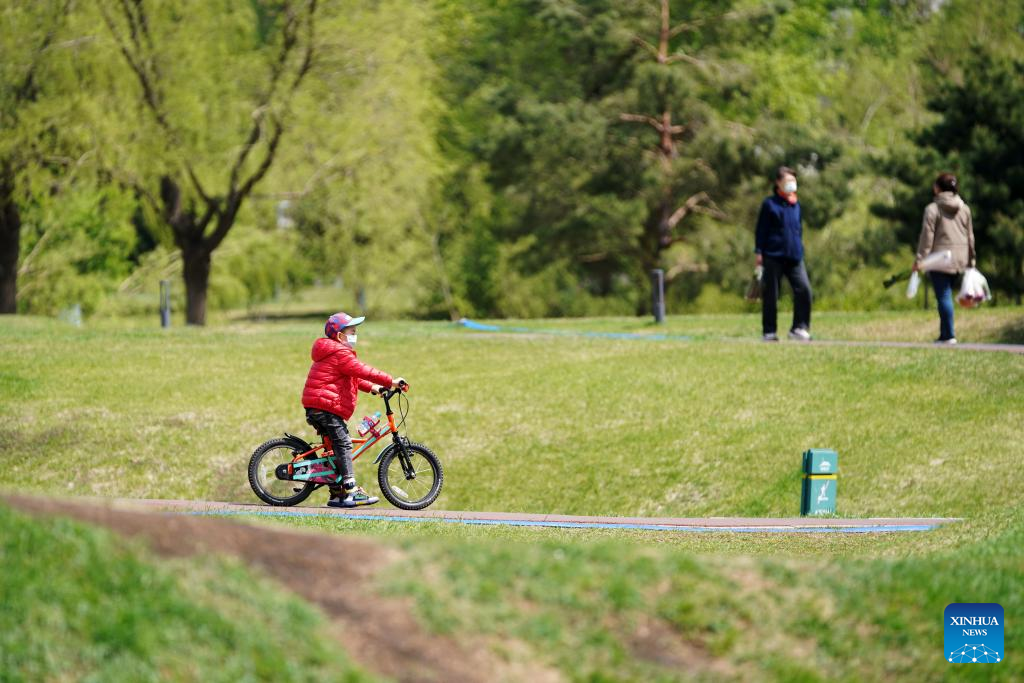 A child rides a bike at a park in Harbin, northeast China's Heilongjiang Province, May 11, 2022. Harbin started to resume normal life and production in an orderly manner from Wednesday. (Xinhua/Wang Jianwei)