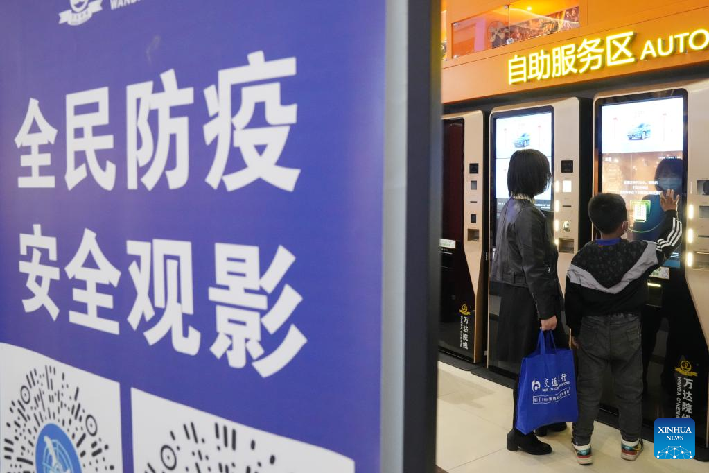 A woman gets movie tickets with her child at a cinema in Harbin, northeast China's Heilongjiang Province, May 11, 2022. Harbin started to resume normal life and production in an orderly manner from Wednesday. (Xinhua/Wang Jianwei)