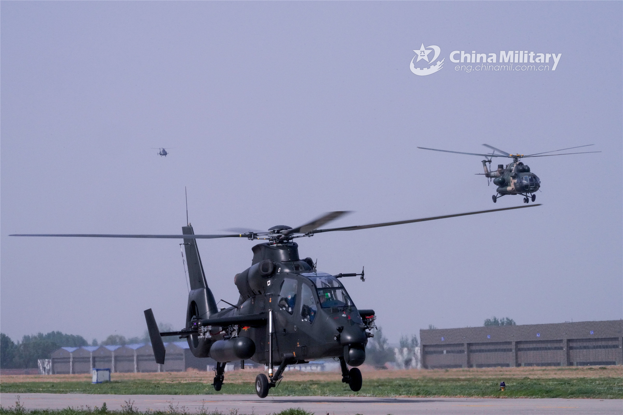 Helicopters of different types attached to an aviation brigade under the PLA 81st Group Army take off in an orderly manner to participate in a round-the-clock flight training exercise on April 20, 2022. (eng.chinamil.com.cn/Photo by Luan Cheng)