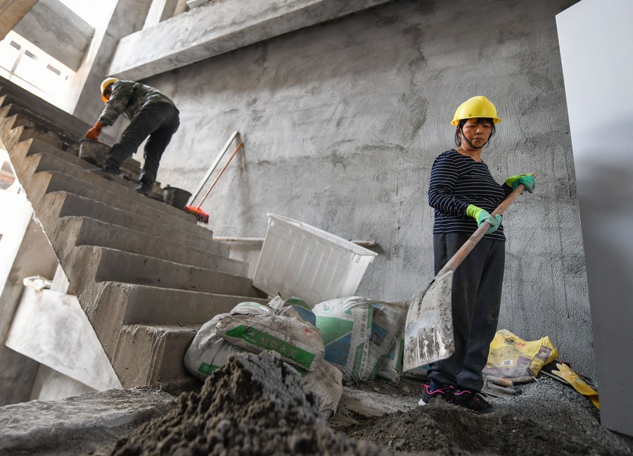 He Chuan plasters a wall and his wife Tang Wenshu mixes mortar at a construction site in Dazhou, southwest China's Sichuan Province, April 29, 2022. (Xinhua/Wang Xi)
