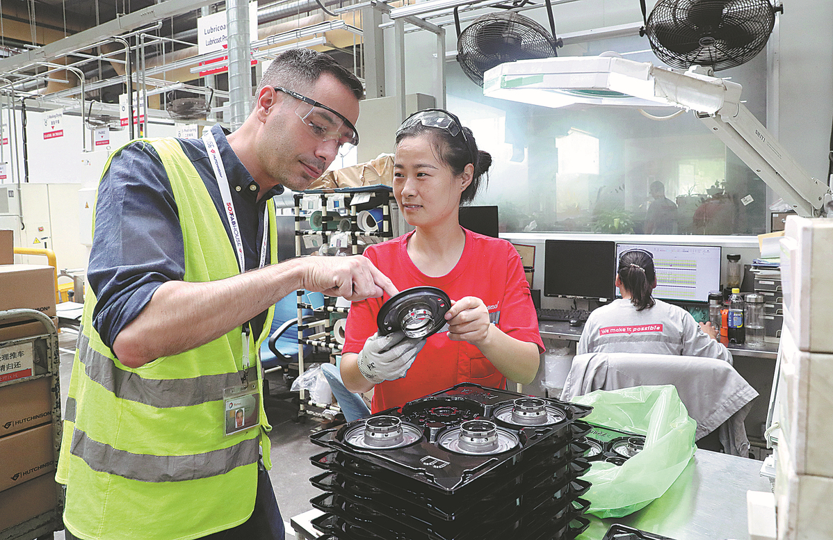 Technicians discuss products at a joint venture in Suzhou, Jiangsu province. HUA XUEGEN/FOR CHINA DAILY