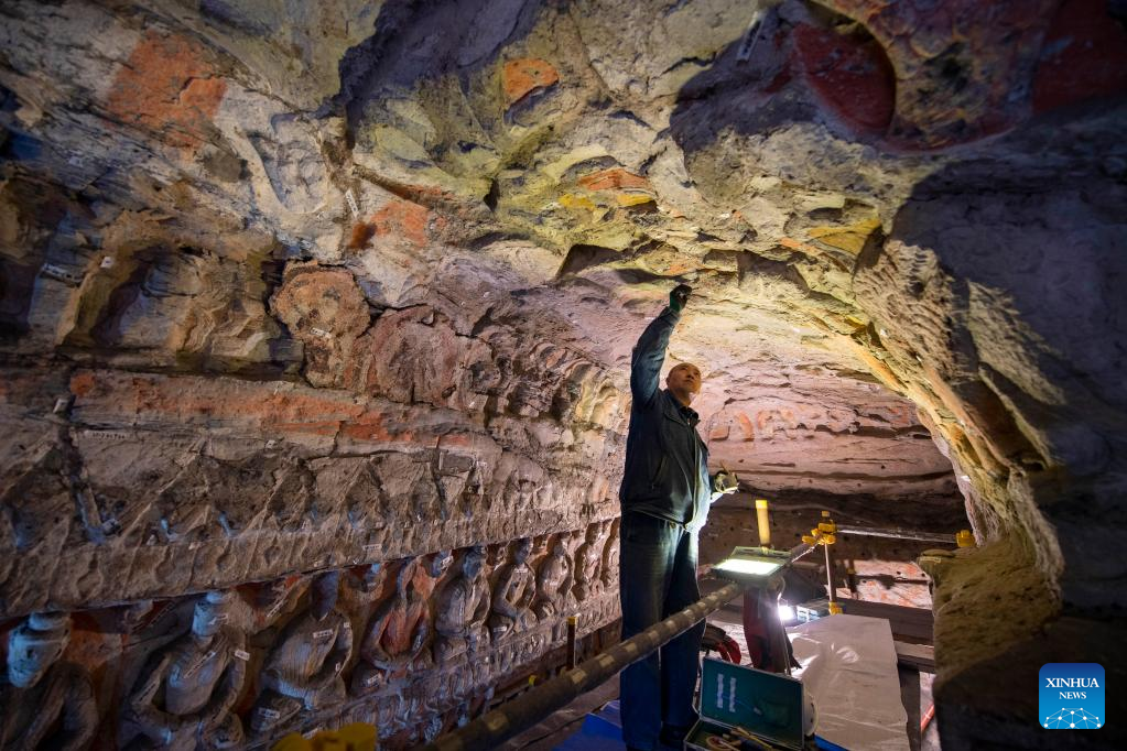 A staff member restores the wall of Cave 1 of the Yungang Grottoes in Datong, north China's Shanxi Province, May 11, 2022.