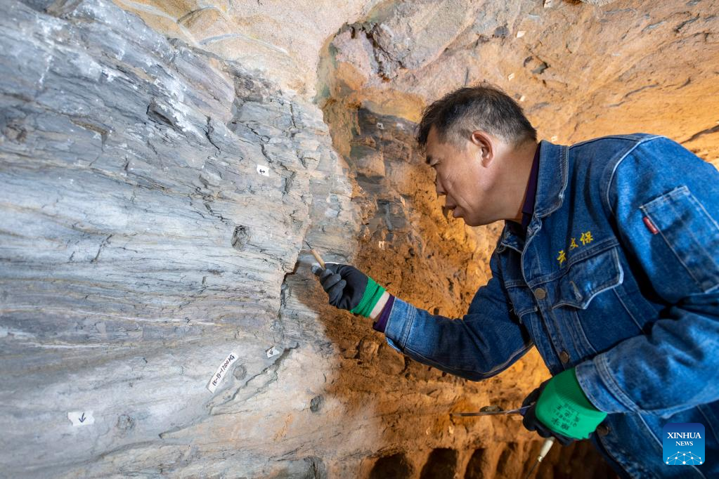 A staff member restores the wall of Cave 1 of the Yungang Grottoes in Datong, north China's Shanxi Province, May 11, 2022.
