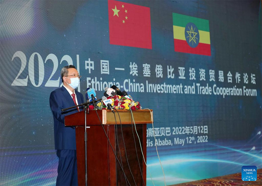 Chinese Ambassador to Ethiopia Zhao Zhiyuan delivers a speech during the China-Ethiopia Investment and Trade Cooperation Forum in Addis Ababa, Ethiopia, on May 12, 2022. Ethiopia and China on Thursday held the investment and trade cooperation forum that aimed at further augmenting trade and economic ties. (Xinhua/Wang Ping)