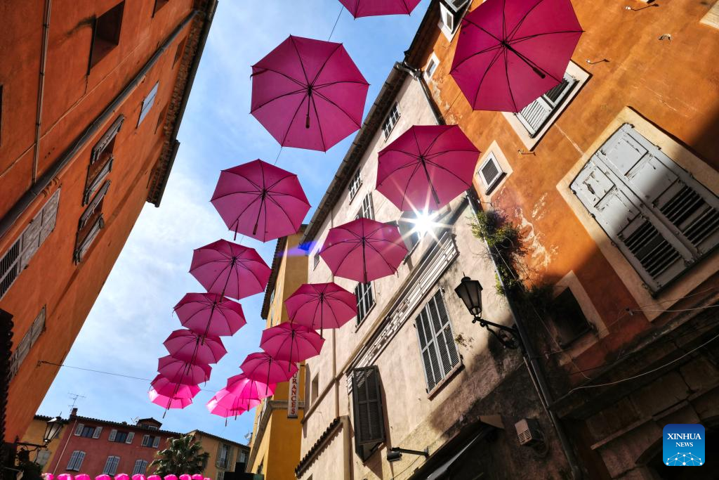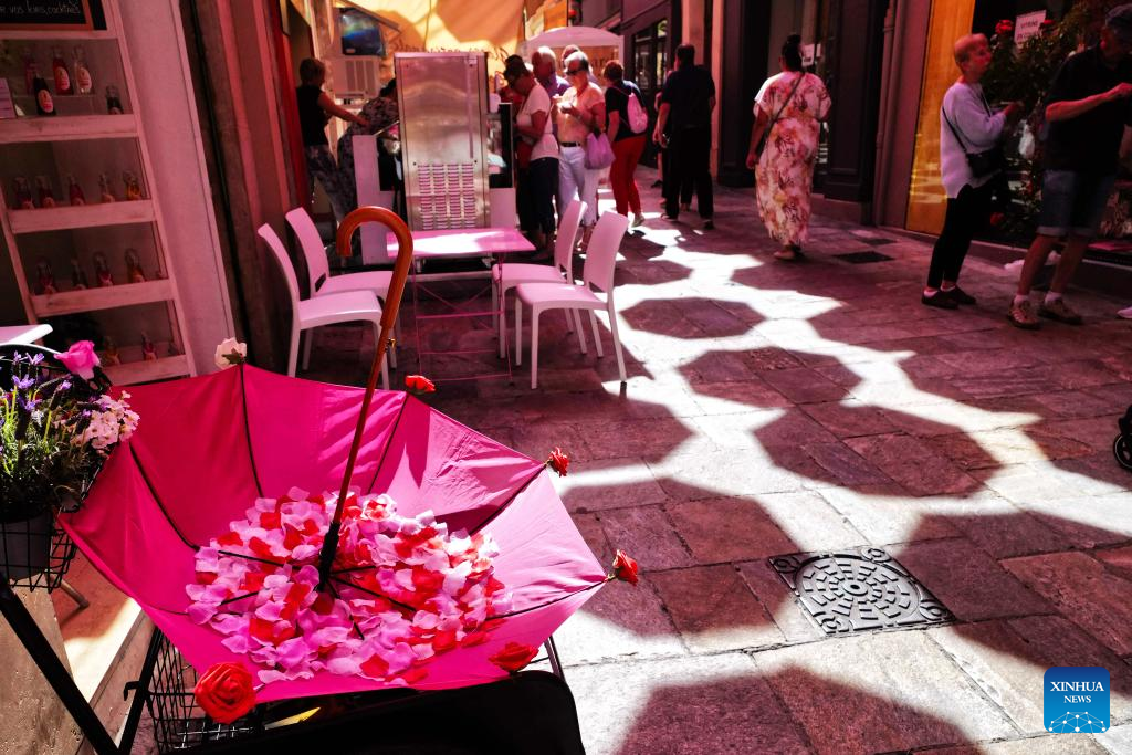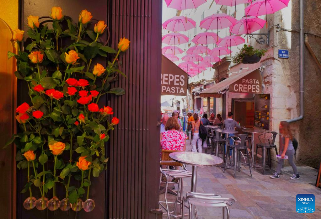 A street is decorated with pink umbrellas during the 50th ExpoRose in Grasse, southern France, on May 13, 2022. The city center of Grasse was turned into rose gardens during the three-day ExpoRose festival which kicked off here on Friday. (Photo by Serge Haouzi/Xinhua)