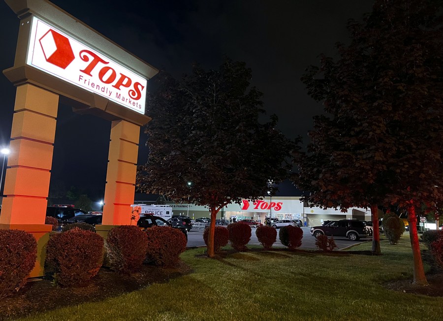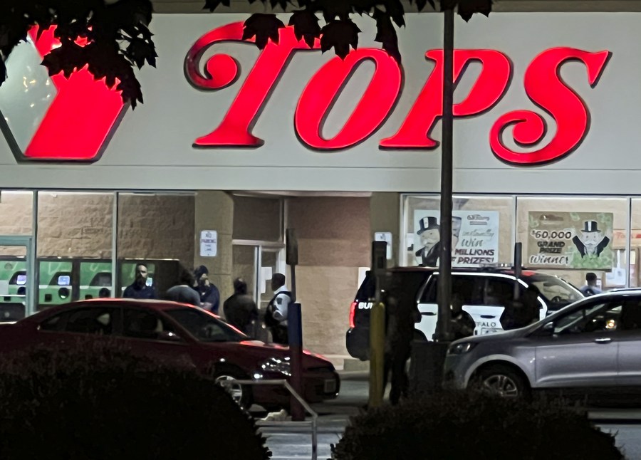 Photo taken with a mobile phone on May 15, 2022 shows the site of a mass shooting in Buffalo of New York State, the United States. (Photo by Zhang Jie/Xinhua)