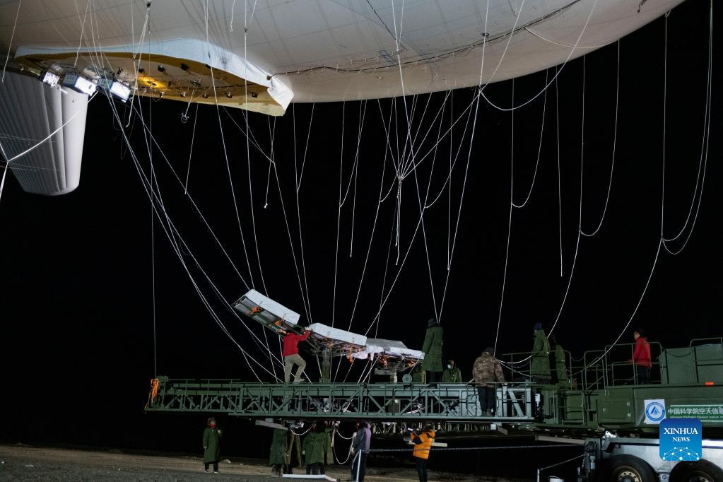 Floating airship "Jimu No.1" type III is being inflated in Zhaxizom Township of Tingri County, southwest China's Tibet Autonomous Region, May 12, 2022. China's self-developed floating airship, designed for atmosphere observation, reached a record altitude of 9,032 meters in Tibet Autonomous Region on Sunday, according to its developer. Developed by the Aerospace Information Research Institute of the Chinese Academy of Sciences (CAS), the floating airship "Jimu No.1" type III has a volume of 9,060 cubic meters. (Xinhua/Jiang Fan)