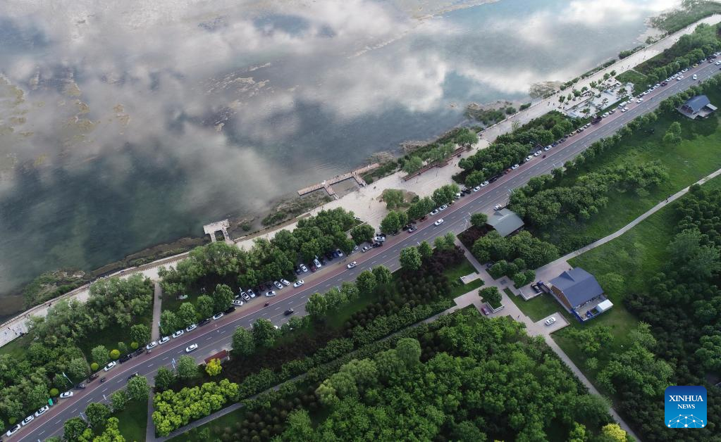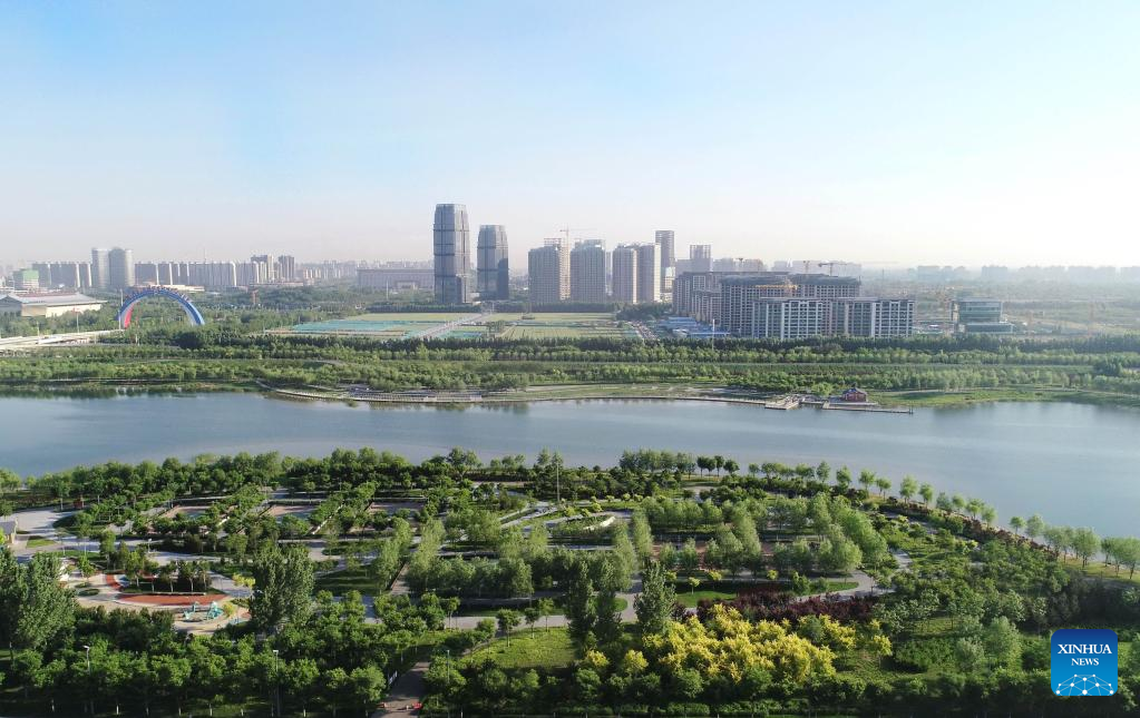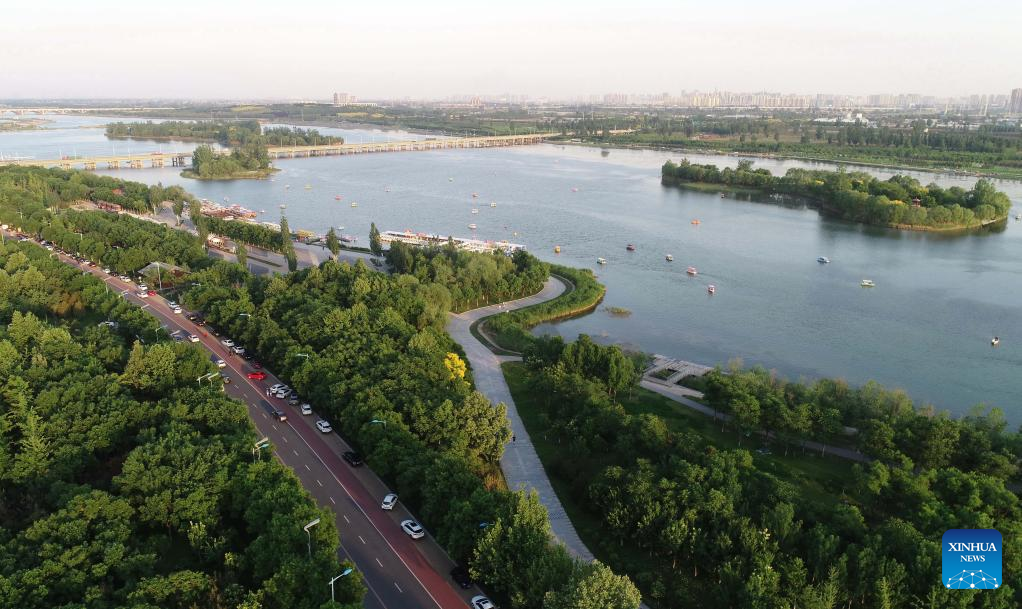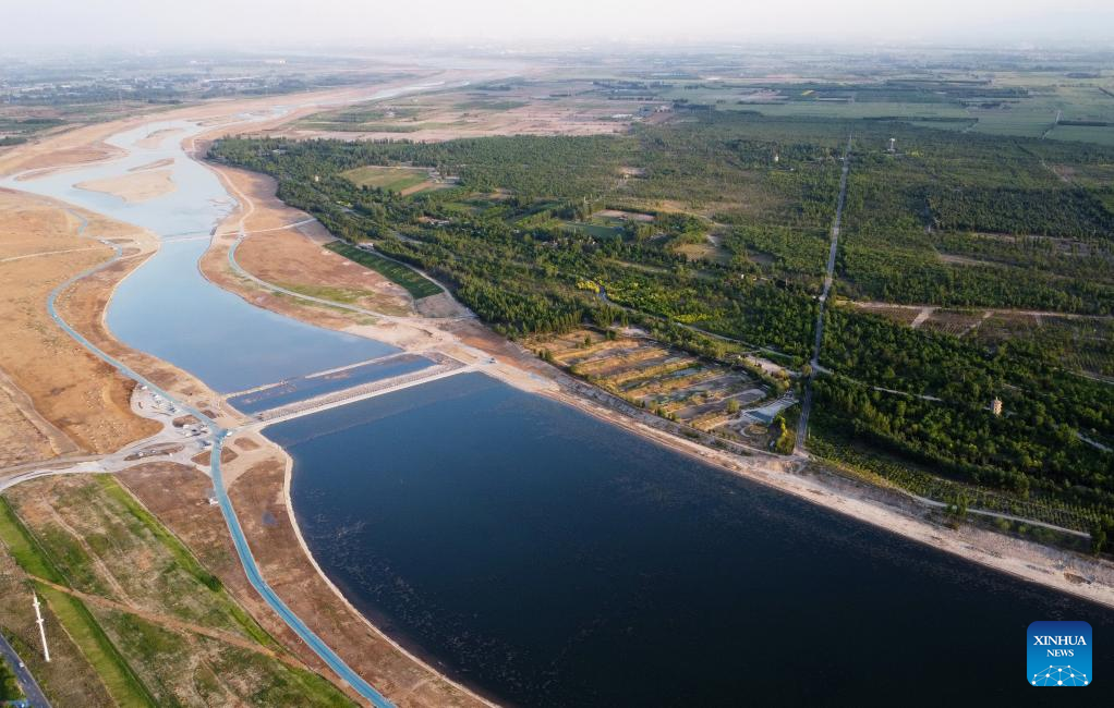 Aerial photo taken on May 15, 2022 shows the scenery of the Hutuo River in Shijiazhuang, north China's Hebei Province. With the ecological restoration project started in 2017, the Hutuo River has now become a new tourist attraction with picturesque sceneries. (Xinhua/Yang Shiyao)
