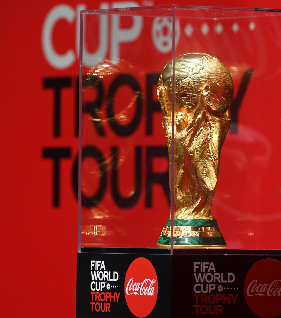 The World Cup trophy is on display during a FIFA World Cup Trophy Tour event in Kuwait City, Kuwait, May 16, 2022. (Xinhua)