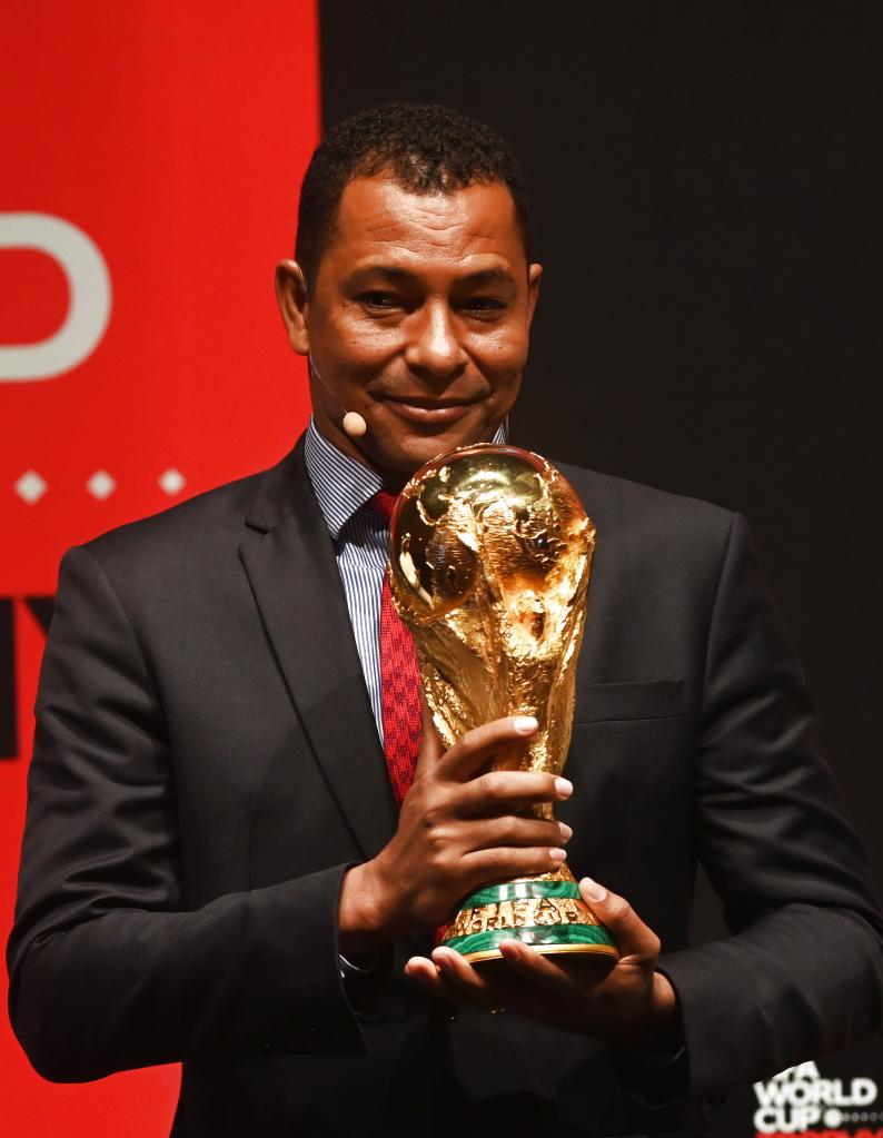Brazilian former soccer player Gilberto Silva displays the World Cup trophy during a FIFA World Cup Trophy Tour event in Kuwait City, Kuwait, May 16, 2022. (Xinhua)