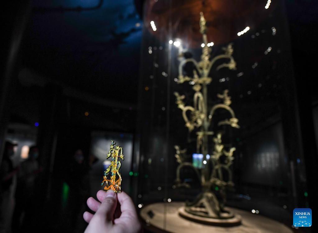 A fridge magnet in shape of a bronze ware is displayed in Sanxingdui Museum in Guanghan, southwest China's Sichuan Province, May 16, 2022. In recent years, important archaeological discoveries from Sanxingdui Ruins site have driven the boom of the designing and sales of cultural and creative products in the Sanxingdui Museum.