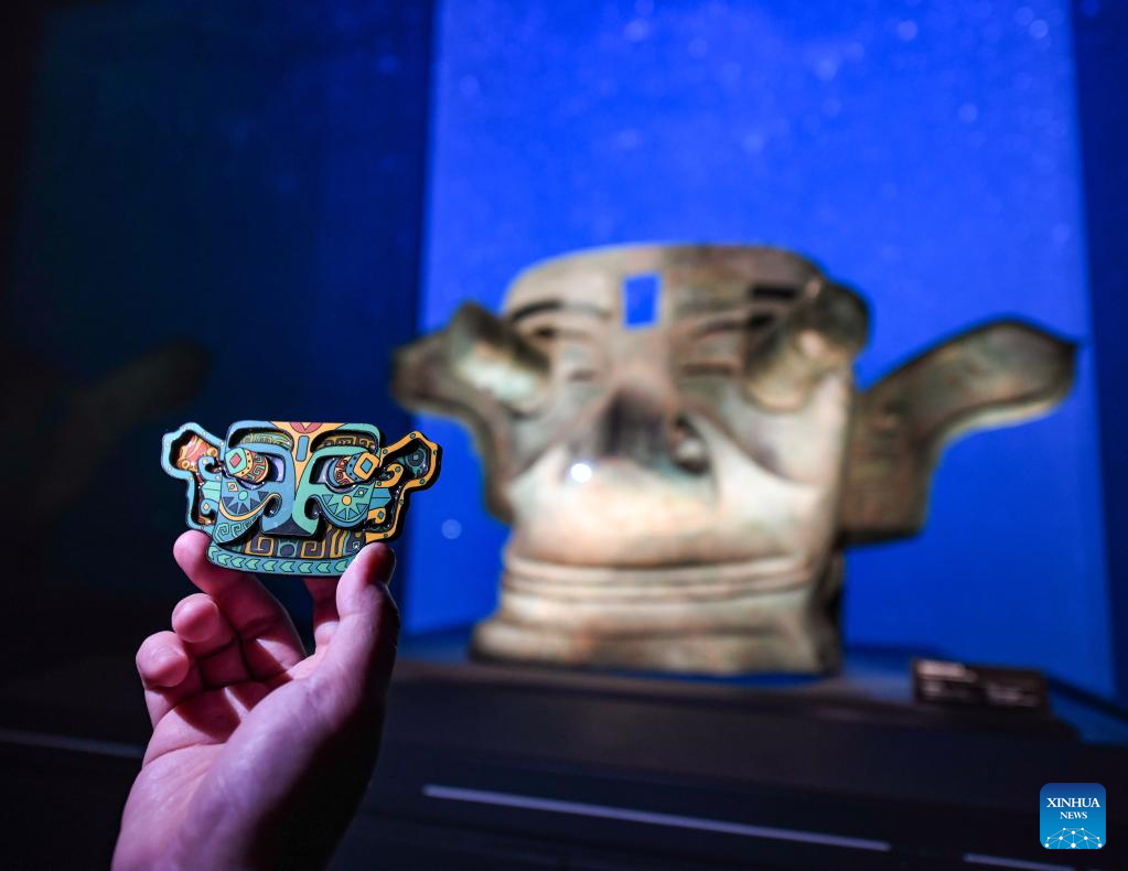 A fridge magnet in shape of a bronze mask is displayed in Sanxingdui Museum in Guanghan, southwest China's Sichuan Province, May 16, 2022. In recent years, important archaeological discoveries from Sanxingdui Ruins site have driven the boom of the designing and sales of cultural and creative products in the Sanxingdui Museum.