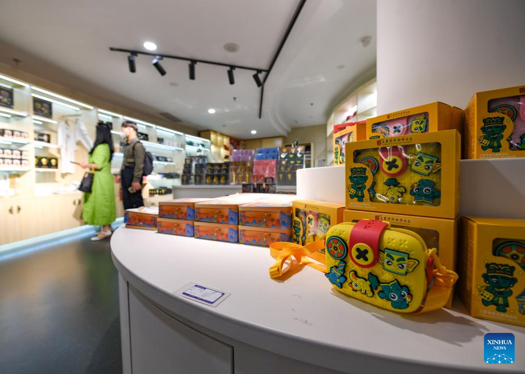 Visitors shop at a souvenir store in the Sanxingdui Museum in Guanghan, southwest China's Sichuan Province, May 16, 2022. In recent years, important archaeological discoveries from Sanxingdui Ruins site have driven the boom of the designing and sales of cultural and creative products in the Sanxingdui Museum.