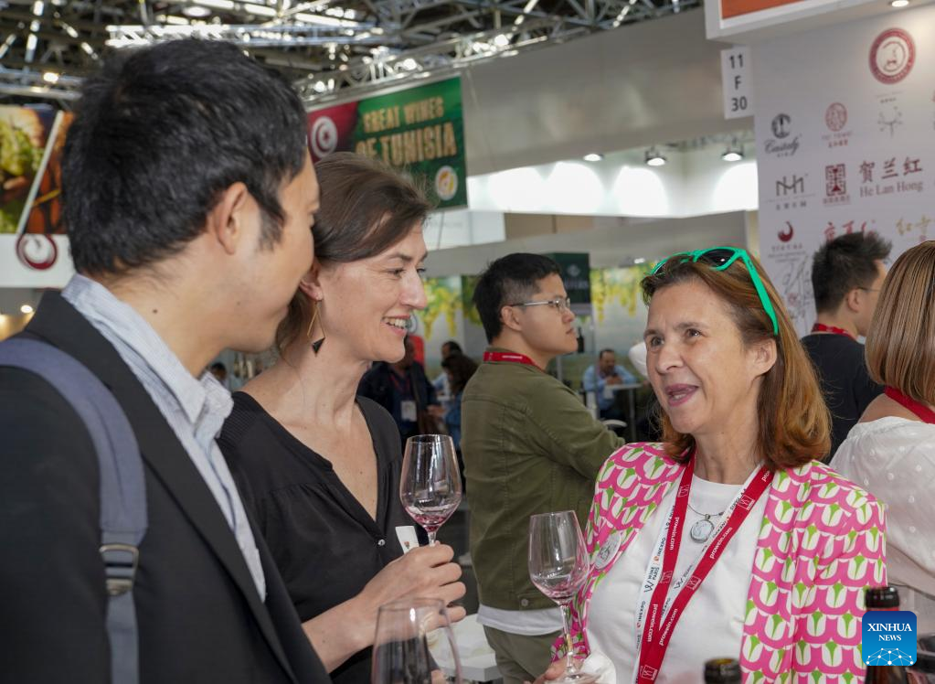 Visitors taste wine of the eastern Helan Mountain of China at the main venue of the ProWein 2022 in Dusseldorf, Germany, May 15, 2022. (Xinhua)