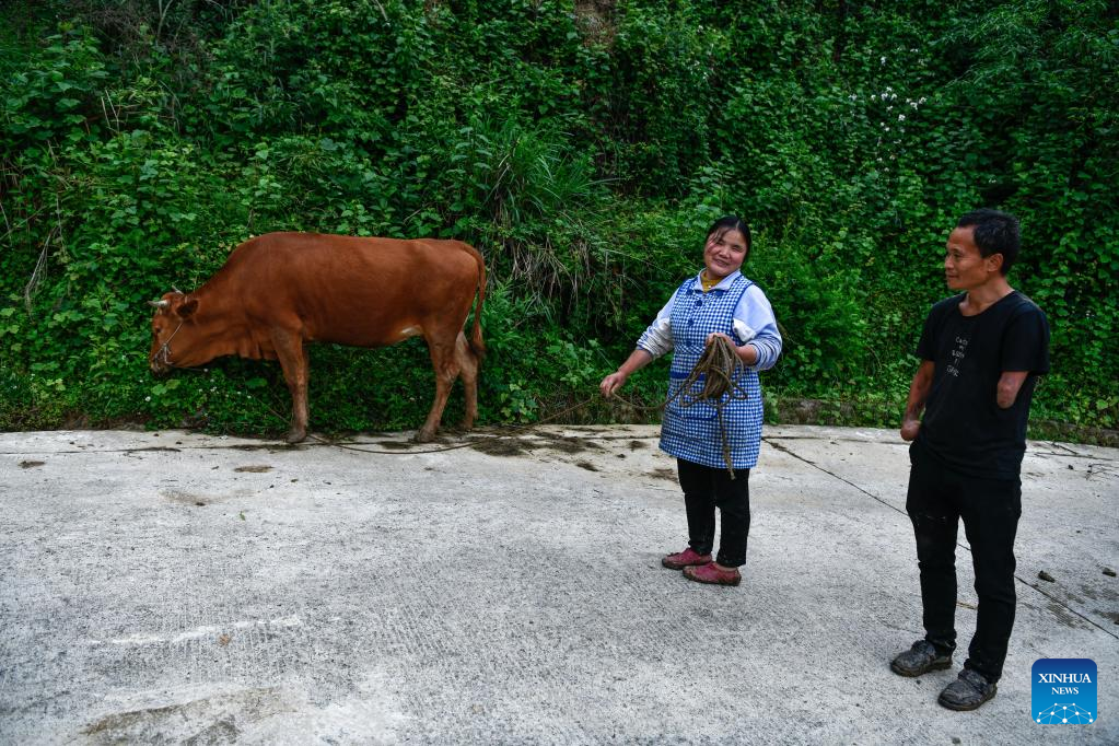Zhao Youliang (R) and Jian Qin herd a cow in Zhongguan Township, Zheng'an County, southwest China's Guizhou Province, May 12, 2022. (Xinhua/Yang Wenbin)