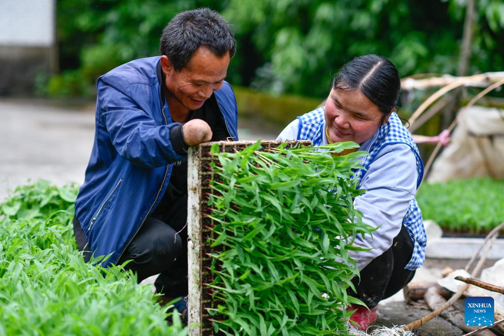 Zhao Youliang (L) and Jian Qin clean the corn seedlings to be transplanted in Zhongguan Township, Zheng'an County, southwest China's Guizhou Province, May 12, 2022. (Xinhua/Yang Wenbin)