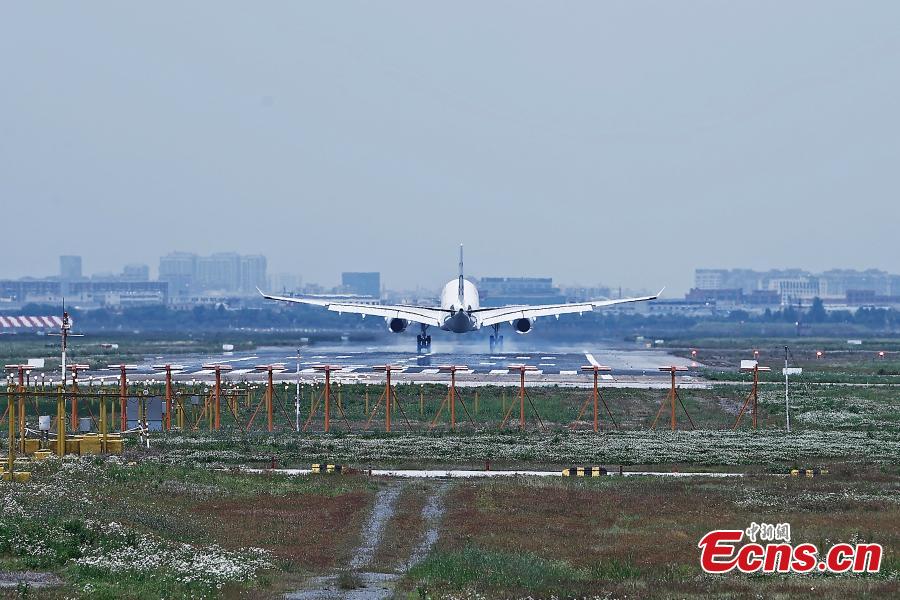 A China Eastern Airbus A330 passenger plane prepares for landing on the runway during a flight training at the Shanghai Hongqiao International Airport, east China's Shanghai, May 16, 2022. (Photo: China News Service/Yin Liqin)