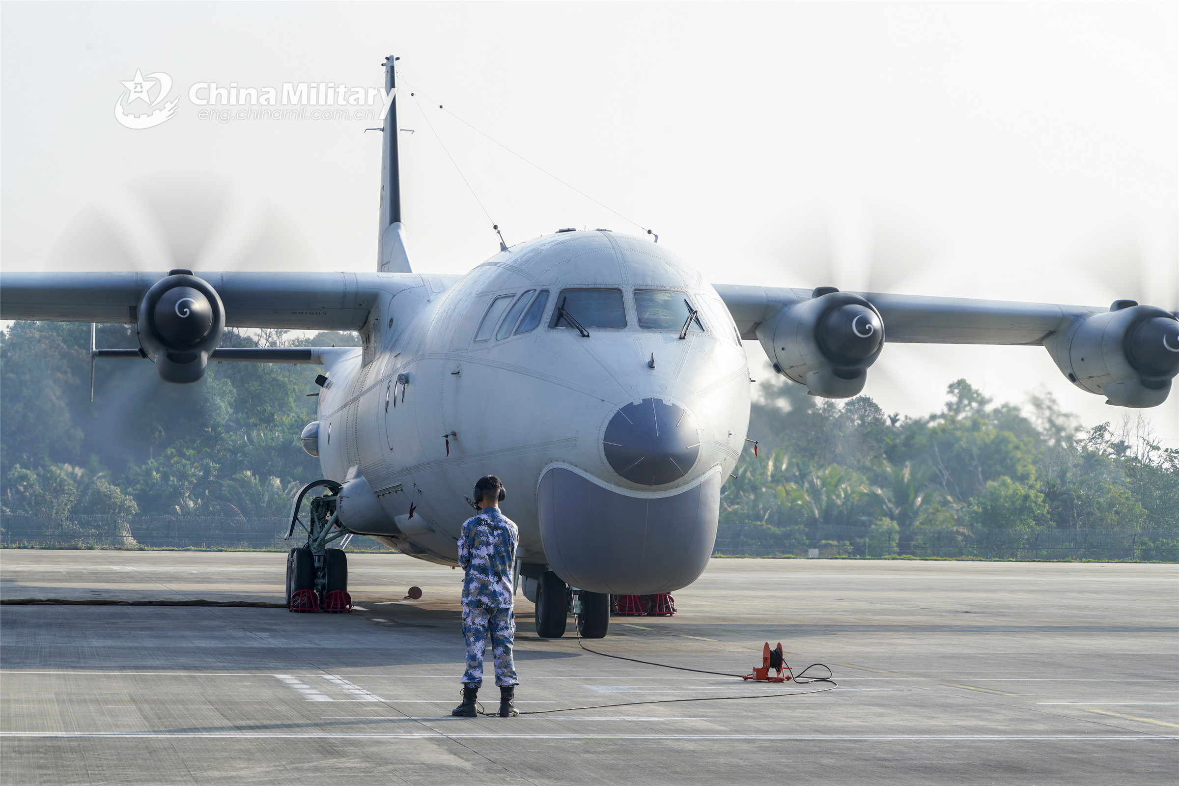 A ground crew member assigned to a naval aviation regiment under the PLA Southern Theater Command tests the electrical system of an anti-submarine patrol aircraft prior to a maritime patrol and anti-submarine training exercise on February 16, 2022. (eng.chinamil.com.cn/Photo by Qin Qianjiang)