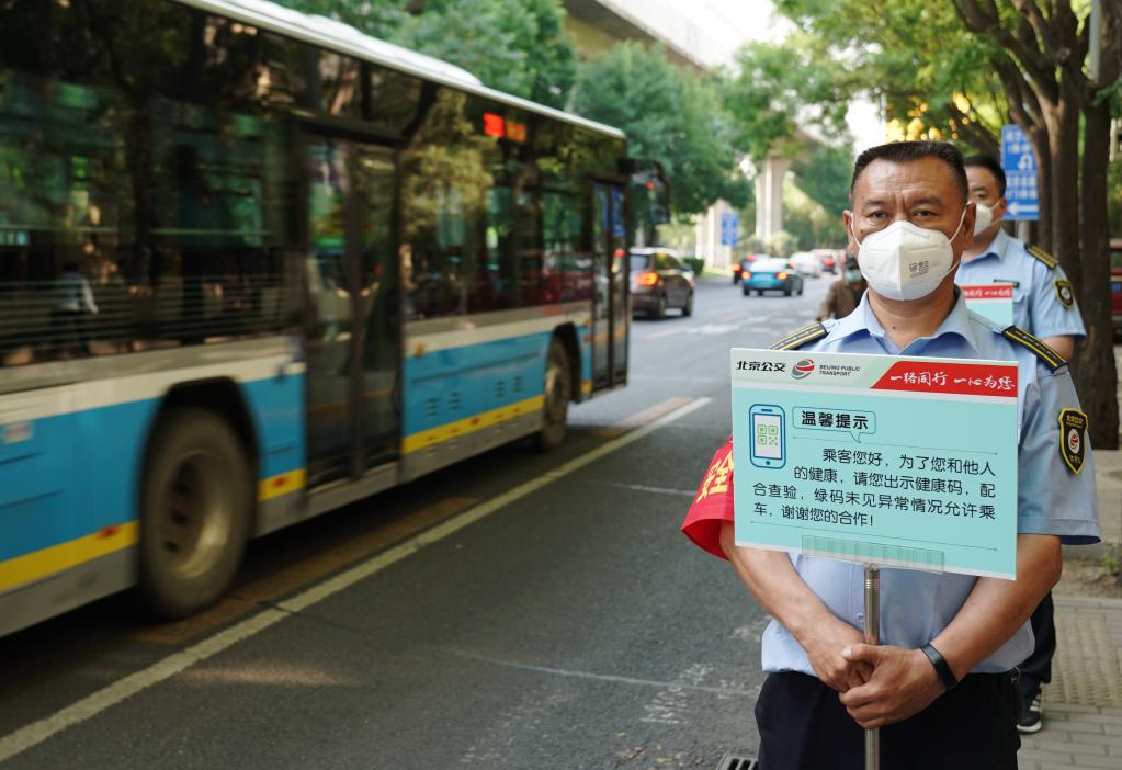 Passengers are required from Tuesday to have their health QR codes checked before taking public transport at some bus stops and subway stations near restrictive control areas and closed-off management areas in Beijing. (Xinhua/Zhang Chenlin)