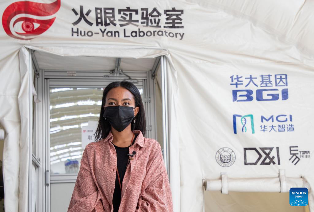 Photo taken on May 4, 2022 shows BGI Health Ethiopia PLC Administration Director Saron Tamirat speaking during an interview at the inflatable COVID-19 testing lab Huo-Yan Air Lab at the Addis Ababa Bole International Airport, Ethiopia. BGI Health Ethiopia, a subsidiary of China's biotech giant, the BGI Genomics Co., Ltd., has won acclaim for its technology and knowledge transfer endeavors to propel Ethiopia's fight against the COVID-19 pandemic. (Xinhua/Michael Tewelde)