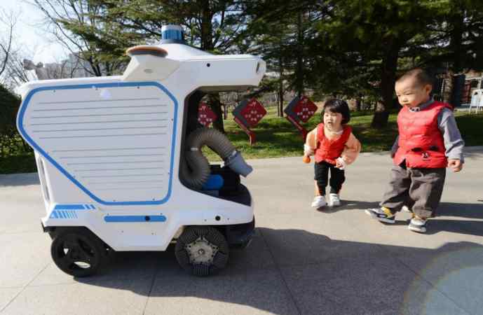 Children watch a newly employed cleaning robot at Zhengzhou Zhilin Park, Zhengdong New District, Zhengzhou city, central China’s Henan province, Dec. 20, 2021. (People’s Daily Online/Zhang Tao)