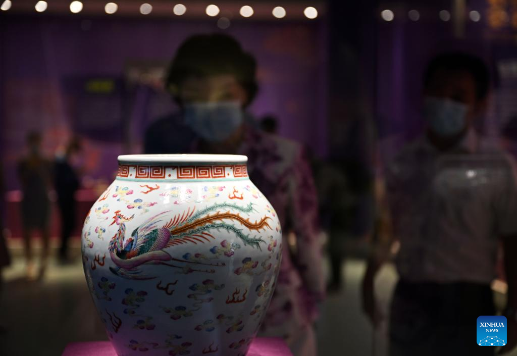 A porcelain of the Qing Dynasty (1644-1911) with patterns of dragon and phoenix is exhibited at Hainan Museum in Haikou, south China's Hainan Province, May 18, 2022.