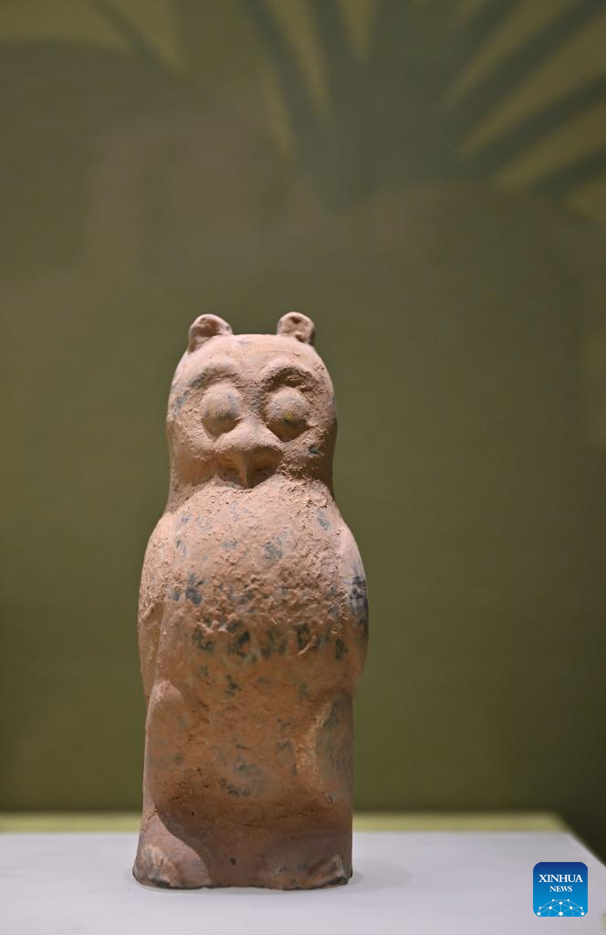 A hawk-shaped pottery of the Han Dynasty (202 BC-220 AD) is exhibited at Hainan Museum in Haikou, south China's Hainan Province, May 18, 2022.