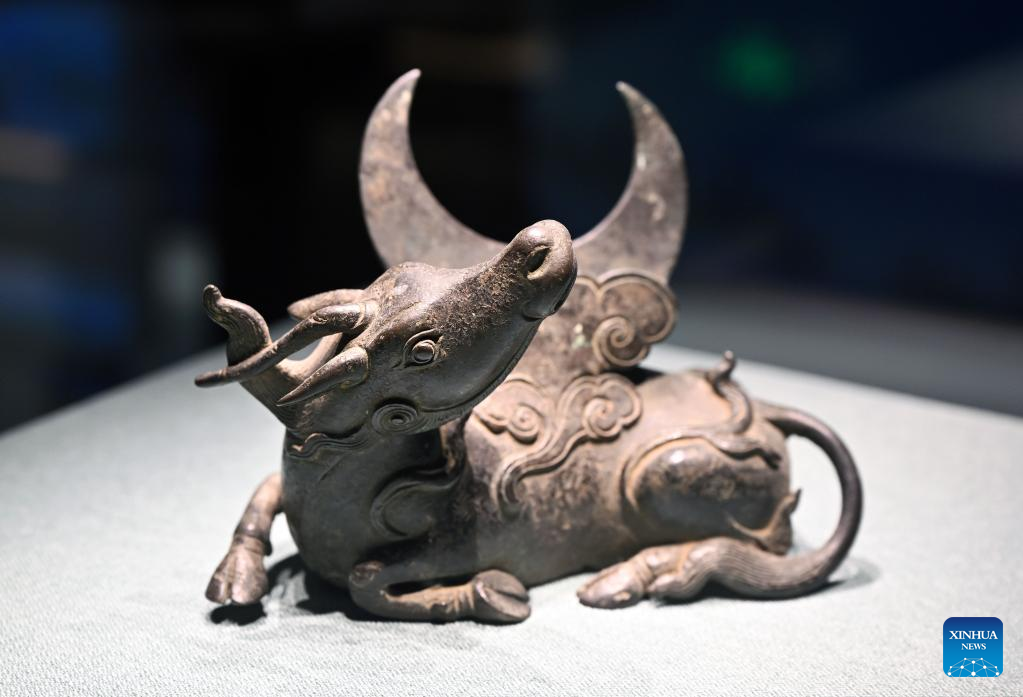 A rhinoceros-shaped mirror bracket of the Qing Dynasty (1644-1911) is exhibited at Hainan Museum in Haikou, south China's Hainan Province, May 18, 2022.