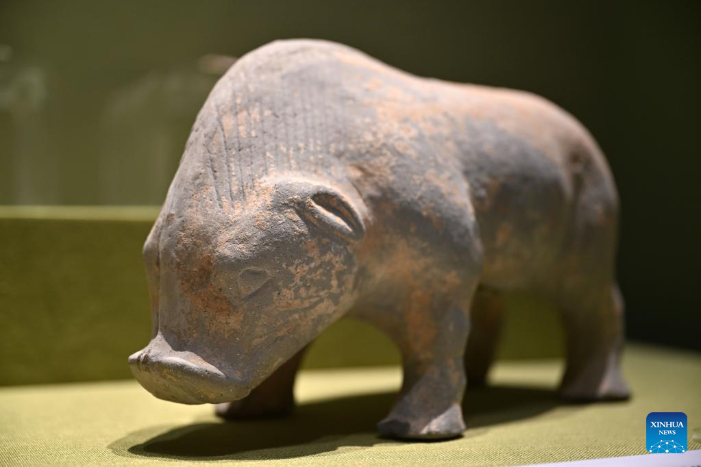 A pig-shaped pottery of the Han Dynasty (202 BC-220 AD) is exhibited at Hainan Museum in Haikou, south China's Hainan Province, May 18, 2022.