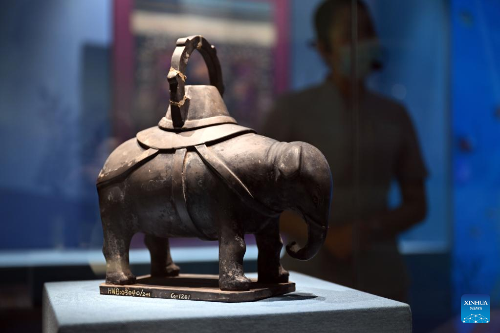 An elephant-shaped pottery of the Yuan Dynasty (1271-1368) is exhibited at Hainan Museum in Haikou, south China's Hainan Province, May 18, 2022.
