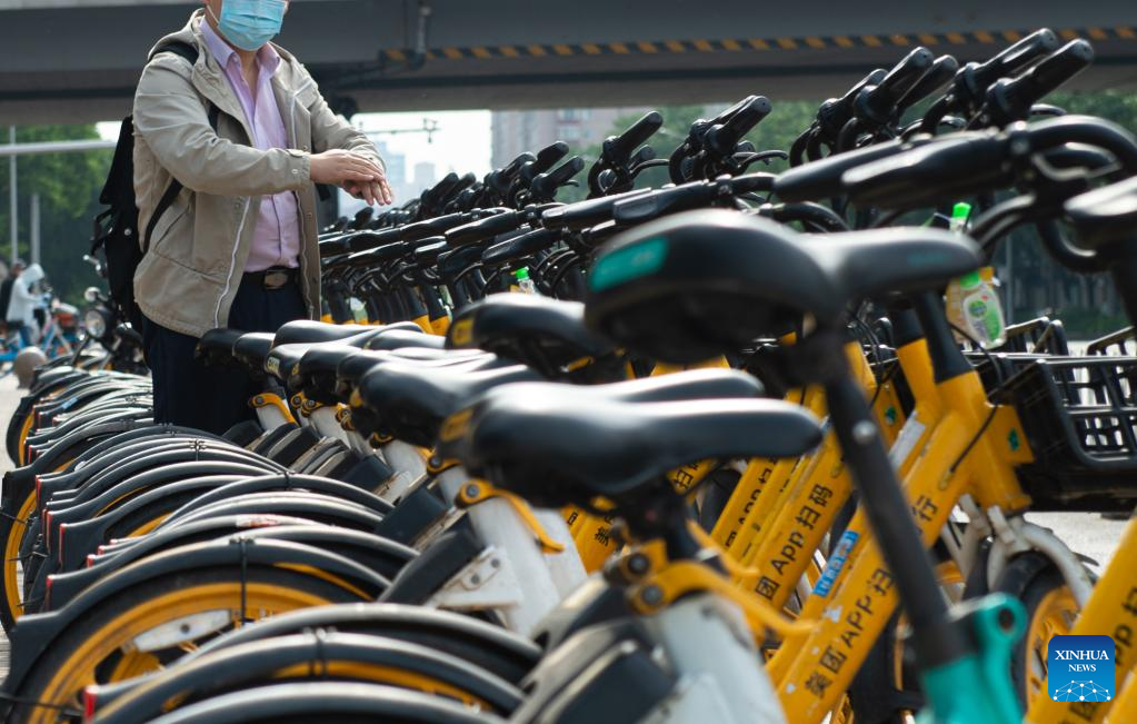 A man scans a QR code to unlock a shared bike outside a subway station in Beijing, capital of China, May 18, 2022. In Beijing, shared bikes have been disinfected and some of them are equipped with hand sanitizers recently as COVID-19 precaution measures, for the sake of the riders' health amid the recent COVID-19 resurgence. (Xinhua/Chen Zhonghao)