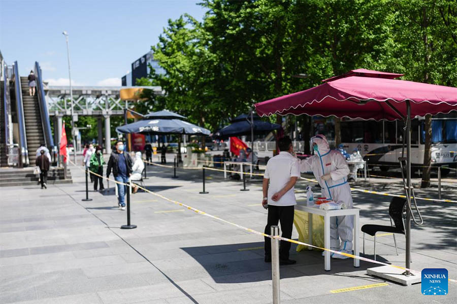 A medic takes a swab sample from a man for nucleic acid test at Xidan area in Beijing, capital of China, May 14, 2022. (Xinhua/Peng Ziyang)