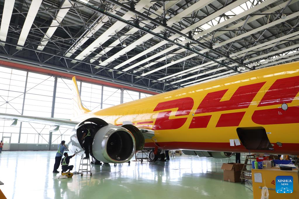 Staff members maintain an airplane at a hangar in north China's Tianjin, May 18, 2022. Recent years Tianjin has been vigorously developing aerospace industry, boosting multiple industrial chains in a bid to promote high-quality development of the city. (Xinhua/Zhao Zishuo)