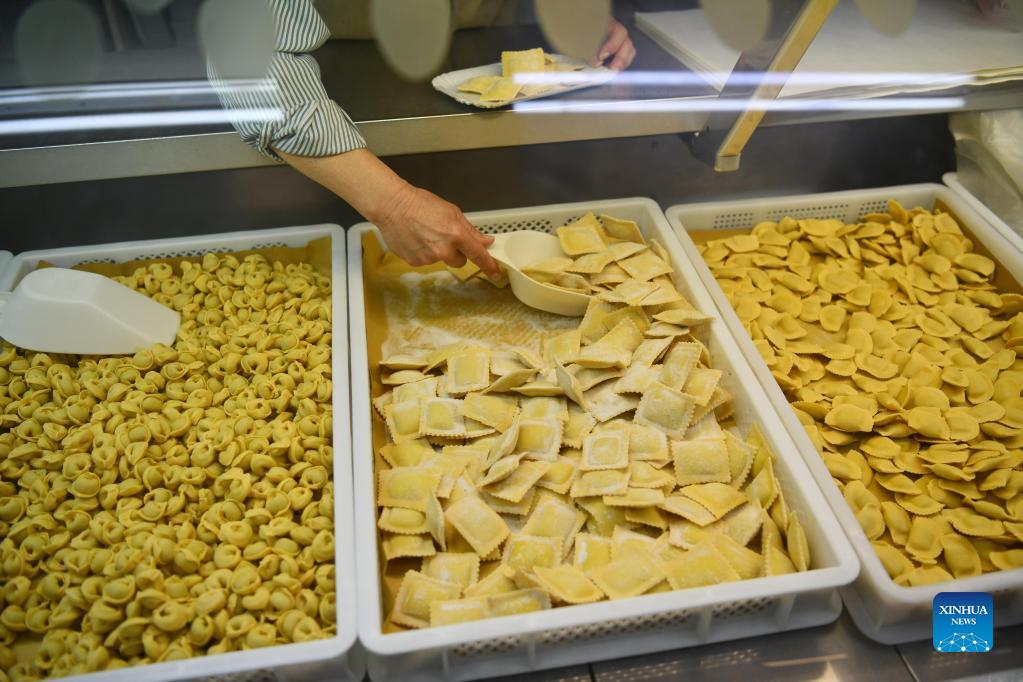 A saleswoman puts ravioli into a plate in Rome, Italy, on May 19, 2022. Italy's most traditional meal -- pasta, which comes in many different forms -- has been getting more expensive in recent months, and indications are that the trend is set to continue. (Xinhua/Jin Mamengni)