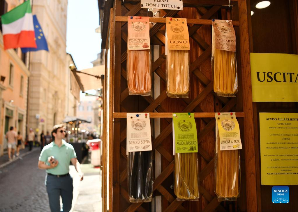 Pastas are seen for sale at a store in Rome, Italy, on May 19, 2022. Italy's most traditional meal -- pasta, which comes in many different forms -- has been getting more expensive in recent months, and indications are that the trend is set to continue. (Xinhua/Jin Mamengni)